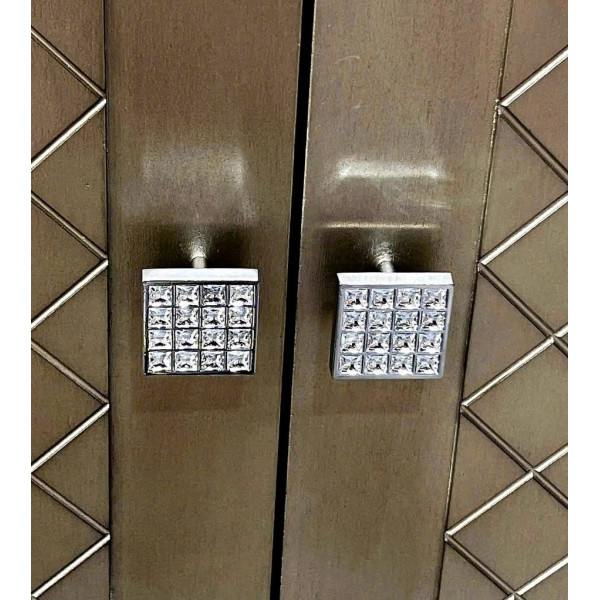 • Điểm nhấn: Hai cánh cửa có họa tiết hình thoi (diamond pattern) dập nổi, được viền bằng gương vát cạnh và sử dụng tay nắm đính đá giả pha lê lấp lánh.